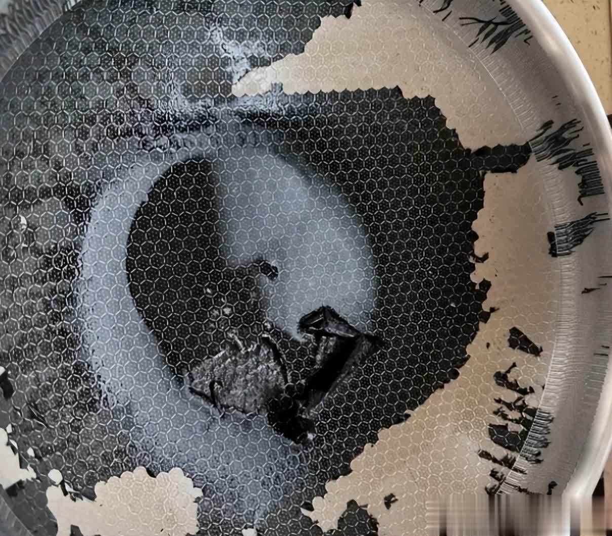 到时候涂层全部都暴露出来,金属成分就释放出出来,到时候你用这样的锅具去炒菜,金属就会进入到食物中,对健康造成威胁。